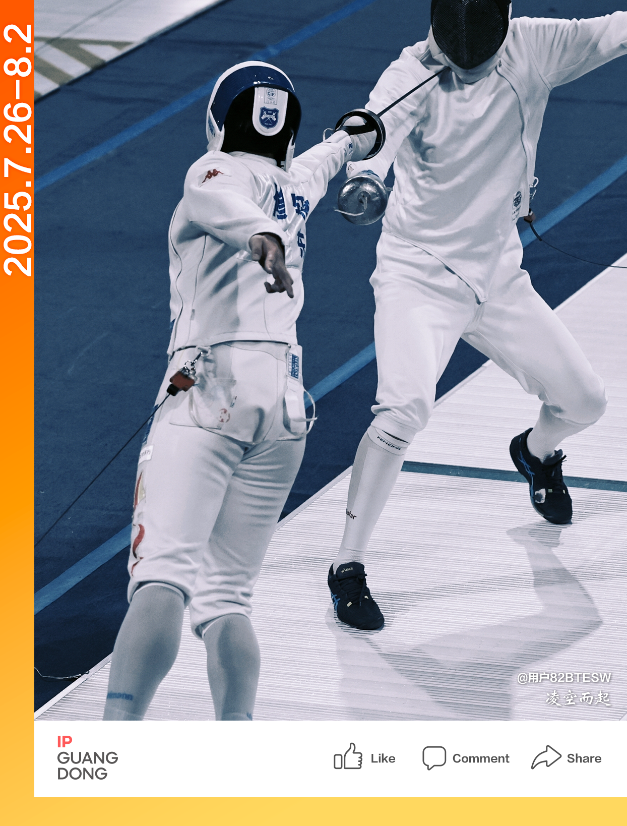 In the lens of @user82BtEsW, the fencing court in Qingyuan is reaching a crucial moment of confrontation. The two fencers are competing with light yet firm steps. At this time, one fencer soars into the air and thrusts out a perfect strike that embodies power, wisdom, and skill.