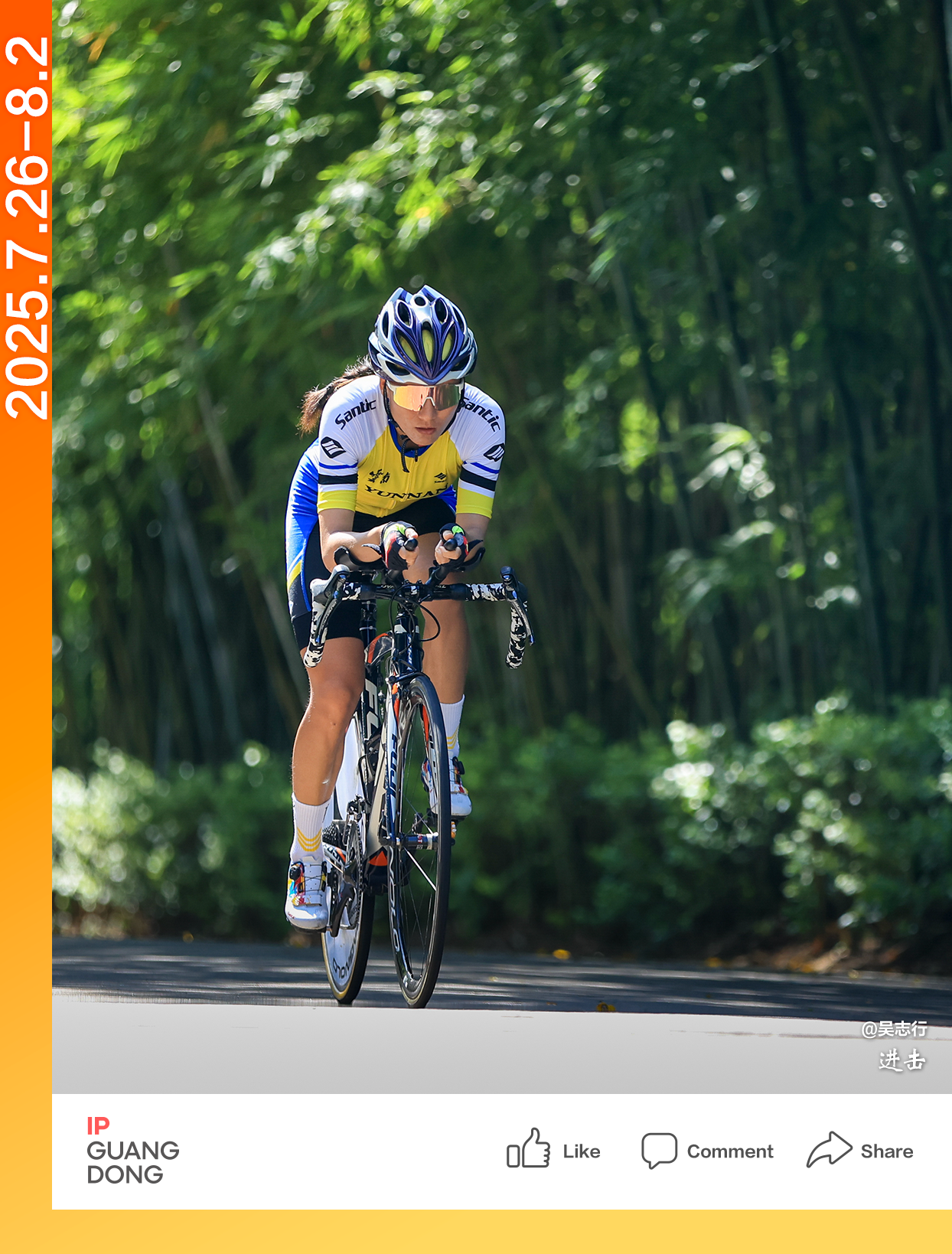 In the cycling event, photographer @Wu Zhixing captures images of athletes riding their bicycles at high speed by the bamboo-shaded track in Shenzhen. They are like arrows in the wind. Every pedal stroke is a challenge to their own limits.
