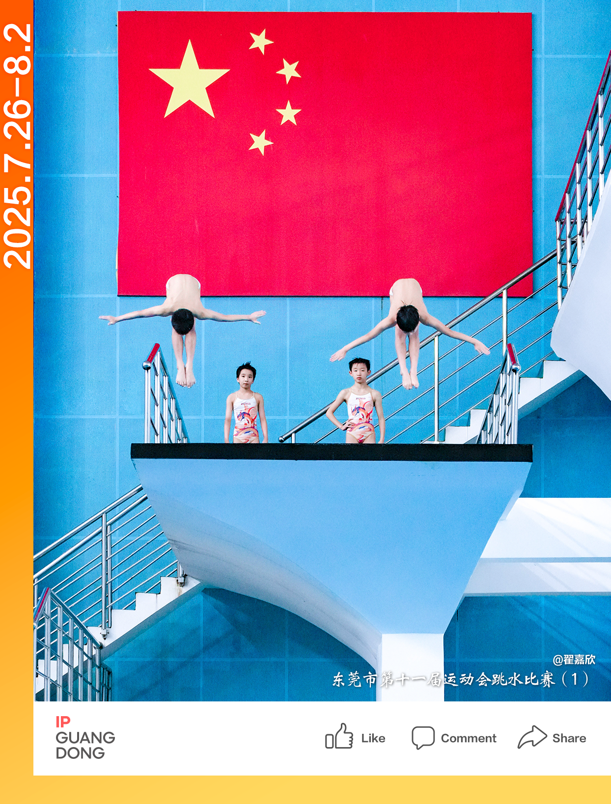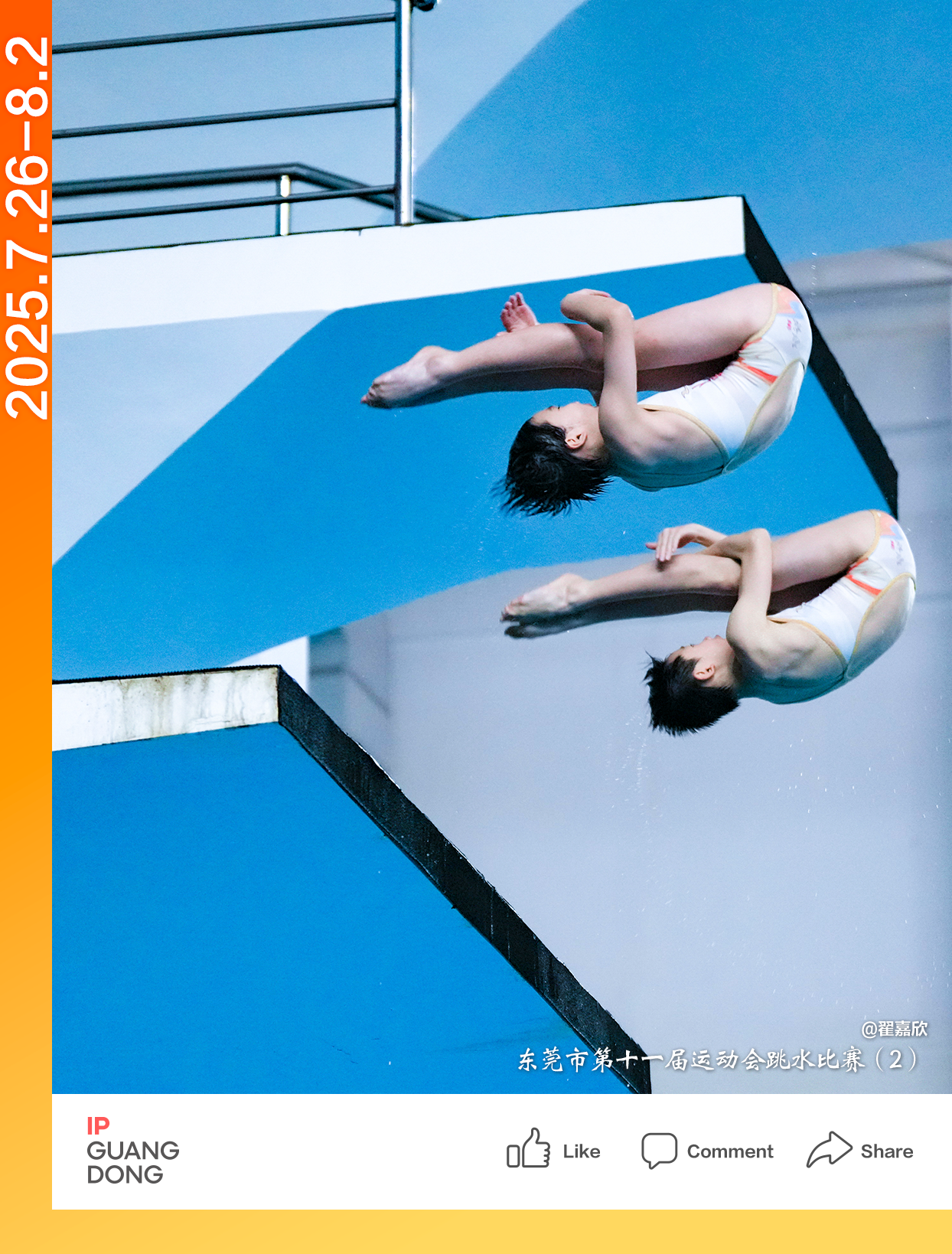 At the diving arena in Dongguan, the new generation of divers is captured by photographer @Zhai Jiaxin. The two young players are flipping in the air like light yet powerful birds, showcasing the strength and artistry of the diving sport.