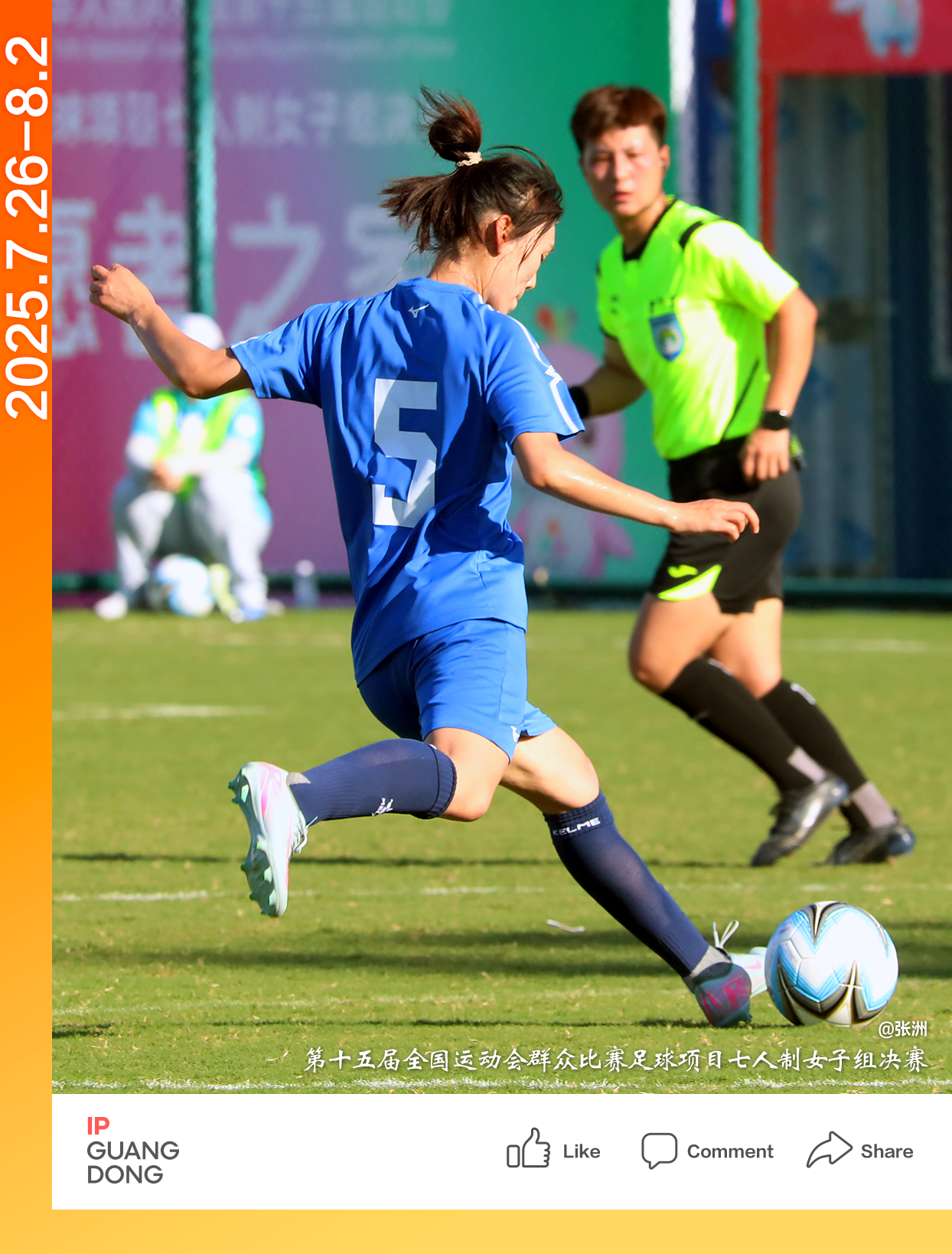 On the green field in Zhuhai, through the lens of photographer @Zhang Zhou, the female football players in blue jerseys display their agile and robust figures as they sprint at full speed. The football at their feet is ready to make a passionate jump.