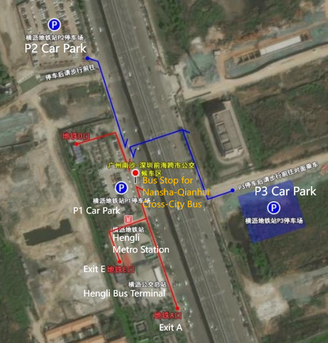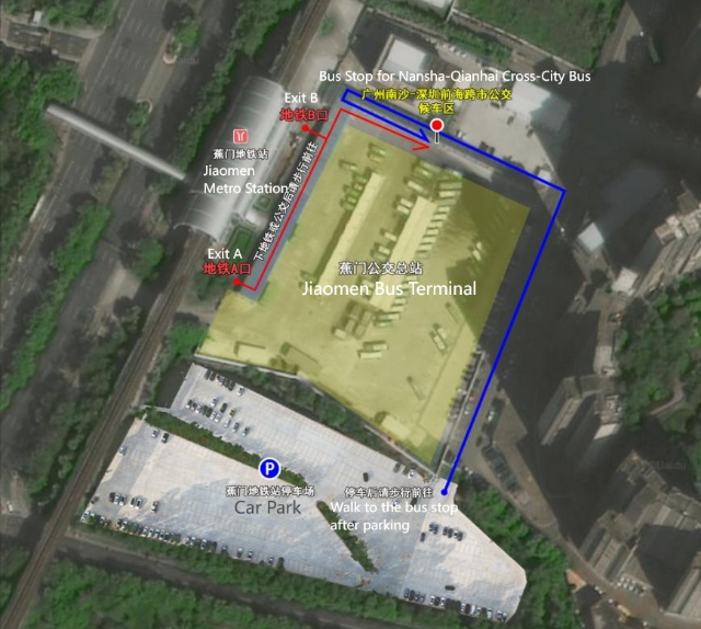 - Guangzhou Jiaomen Bus Terminal (广州蕉门公交总站) (transfer to Guangzhou Metro Line 4)