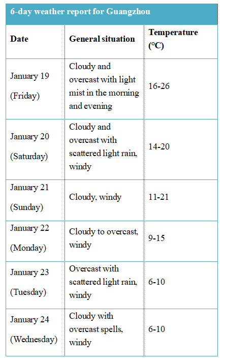 On January 19, Qingyuan, Shaoguan and Zhaoqing will be cloudy to overcast with light to moderate rain. Eastern coastal areas will have scattered light rain. The rest of the province will be cloudy. Lows: 12 to 16℃ in eastern Guangdong and the Pearl River Delta, 18 to 23℃ near the Pearl River estuary and western Guangdong, and 16 to 18℃ in the remaining areas.