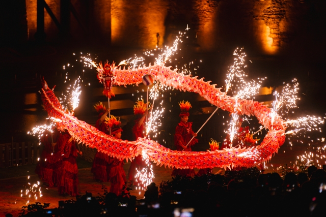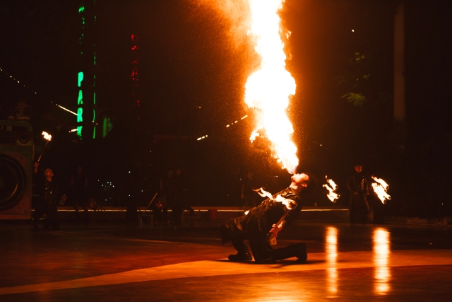 The Mars Concert featured soaring soundwaves and singing atop fire. The "Blazing Fire Ceremony" was a breathtaking spectacle of relentless fiery storms. The main event used fire as a brush and the sky as a canvas, bringing together intangible cultural heritage fire skills like fire pots, fire-spitting, fire cubes, and the Flame Blade. Combined with lion dances, firework dragons, and other Cantonese-style Guochao elements, it showcased Chinese flame aesthetics.