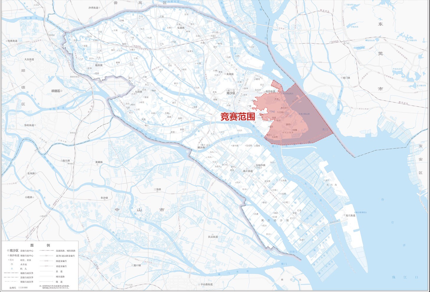 The competition site is located in Gangwan Sub-district, Nansha District, Guangzhou, China, covering an area of approximately 55 km², which includes about 30 km² of land area and 25 km² of sea area.
