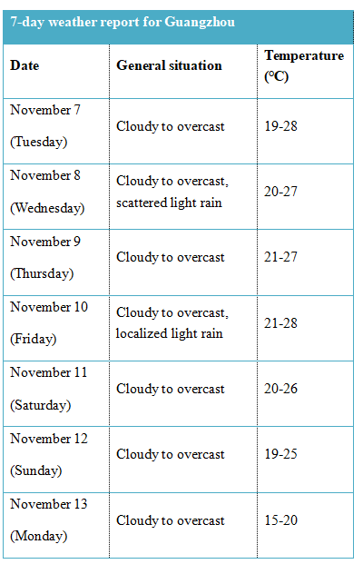 On November 7, overcast skies with scattered light rain are expected in Qingyuan, Shaoguan, the western Pearl River Delta and western Guangdong. The rest of the province will be cloudy to overcast with localized light rain. The lows will hit 16℃-18℃ in northern Guangdong and northern Pearl River Delta, 22℃-25℃ in Leizhou Peninsula, and 18℃-22℃ in most of the province.