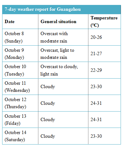 On October 8, there will be heavy rain and localized torrential rain in the Pearl River Estuary. The remaining areas will be cloudy to overcast with showers. The highs will hit 25℃-27℃ in north and east Guangdong, 30℃-32℃ in west Guangdong and 28℃-30℃ in the rest of the province.