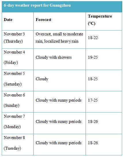 On November 3, western parts of the Pearl River Estuary are to experience moderate to heavy rain, with localized torrential rain. Other areas will see cloudy skies with small to moderate rain.