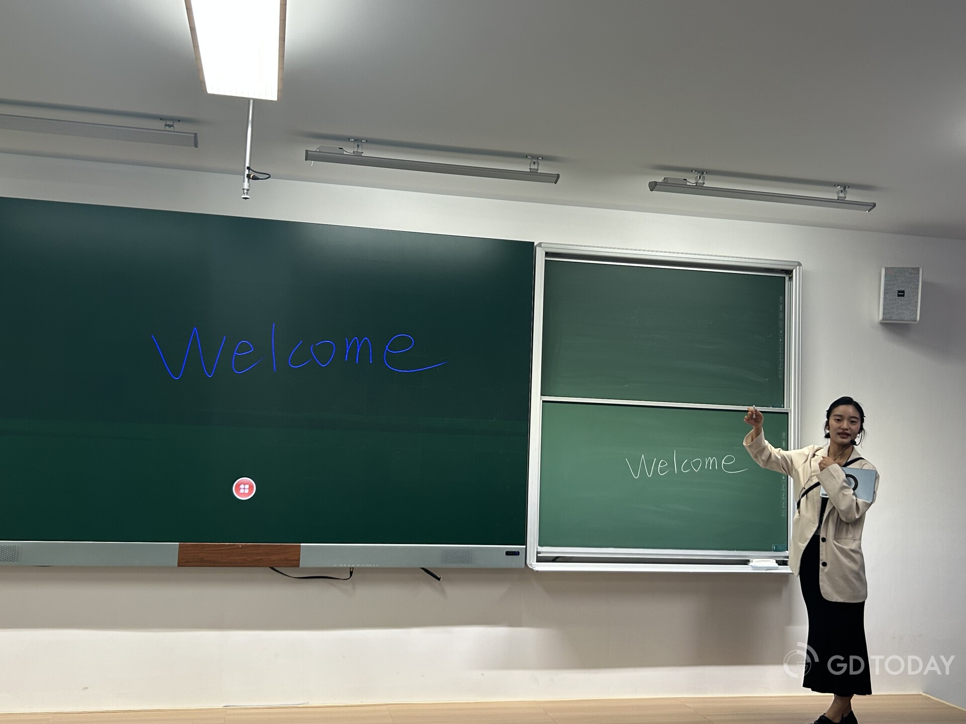 A solution for smart classroom. The screen in the middle can reflect notes on blackboades or display ppt on the computer.