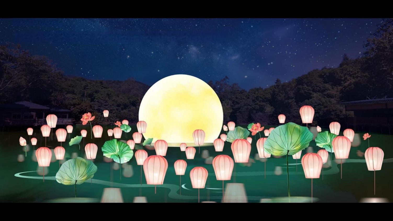 Rendering of a lantern display "Maofeng Dawn Moon" that replicates the moonlight over the lotus pond
