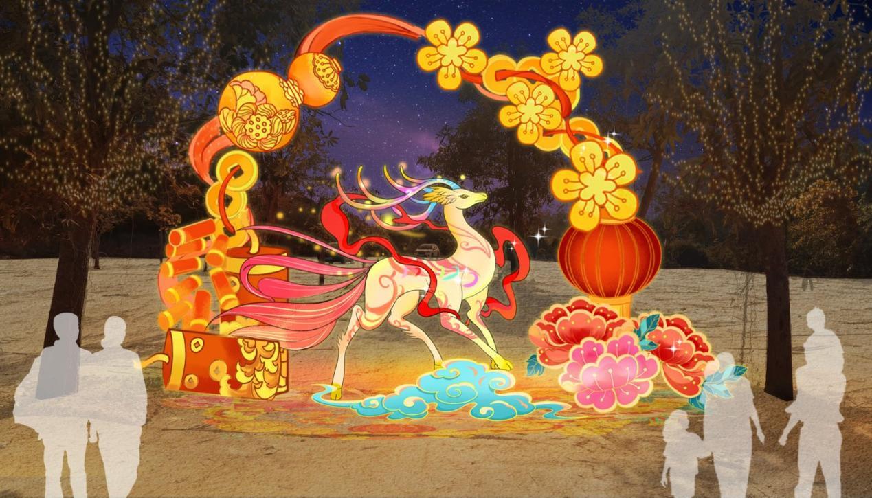 Rendering of a large lantern display "Auspicious Deer" featuring the "Calls of Deer"