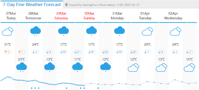March 28: Most of Guangdong will see moderate thunderstorms, with some areas experiencing heavy to torrential rain, strong winds, and short-term heavy downpours. Temperatures will range from 13-16°C in northern Guangdong and 16-22°C in other areas.