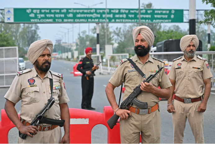 Policemen stand guard at the entrance road of Sri Guru Ram Dass Jee International Airport on the outskirts of Amritsar on May 7, 2025. (Photo: CFP)