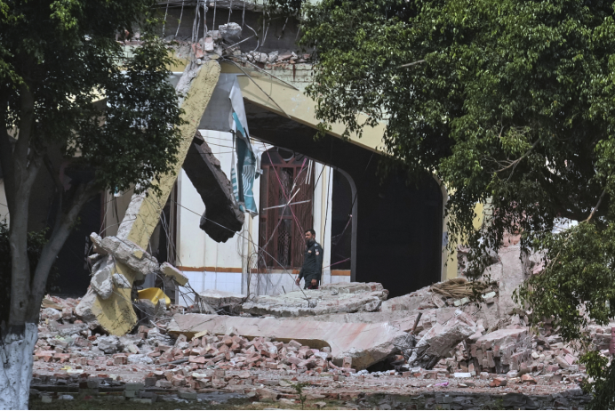 A private security guard walks through rubble of a damaged building after a suspected Indian missile attack, in Muridke, a town in Pakistan's Punjab province (Photo: CFP)