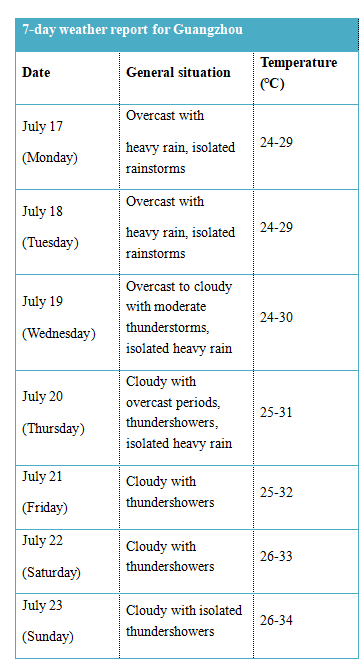 Rainstorms will hit western Guangdong and coastal cities and counties in the Pearl River Delta on July 17. The remaining areas will see moderate to heavy rain with localized rainstorms.
