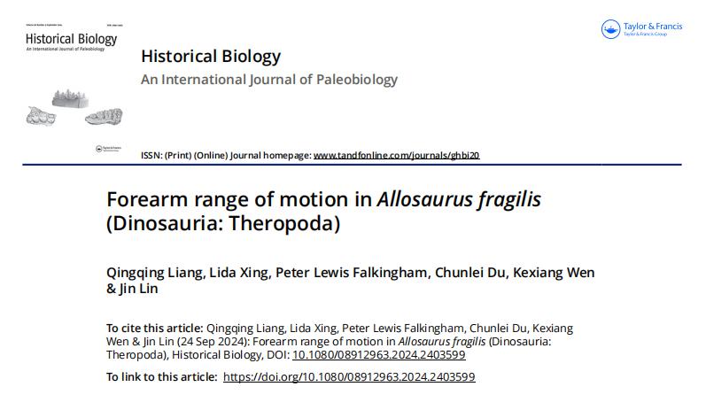 Recently, the Grandview Museum of Natural Science ("the Museum"), a non-state-owned museum, published its latest research paper titled "Forearm range of motion in Allosaurus fragilis (Dinosauria: Theropoda)" in the international journal Historical Biology. This is the Museum's third paper, which has been included in SCI for just a few years since its establishment.