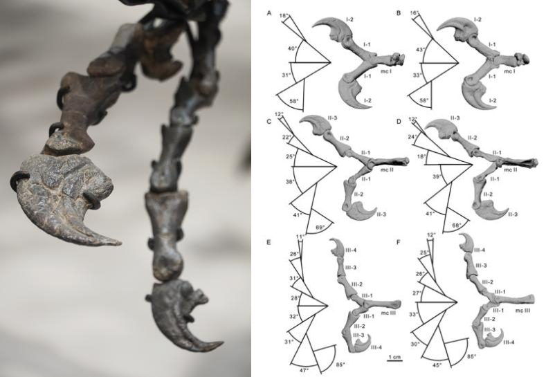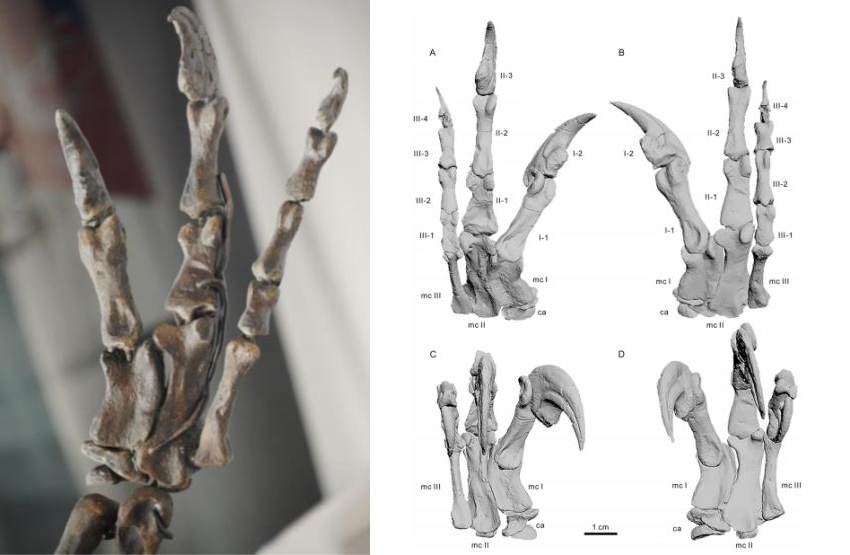 Left: The forelimb palm of the Allosaurus fragilis specimen; Right: Digital mounting manus of Allosaurus fragilis, palmar view.