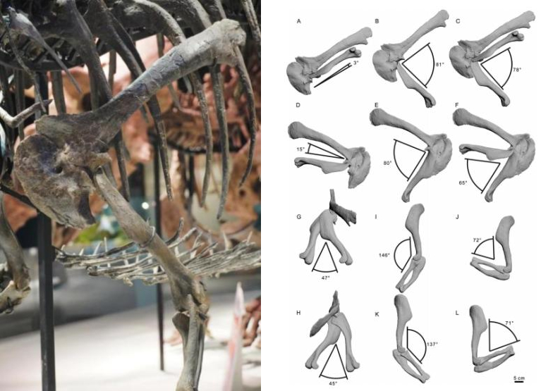 Left: Image of the Allosaurus fragilis's forelimb; Right: Range of motion in the forelimbs of Allosaurus fragilis.