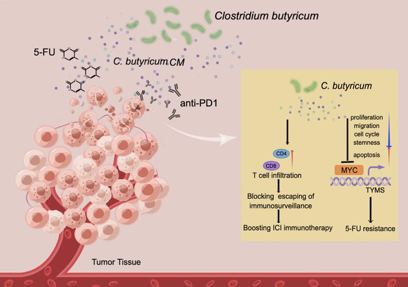 Schematic summary of C.B's role in modulating 5-FU (one of the most commonly used drugs to treat cancer) drug resistance and boosting anti-PD1 immunotherapy. (Photo provided to GDToday)
