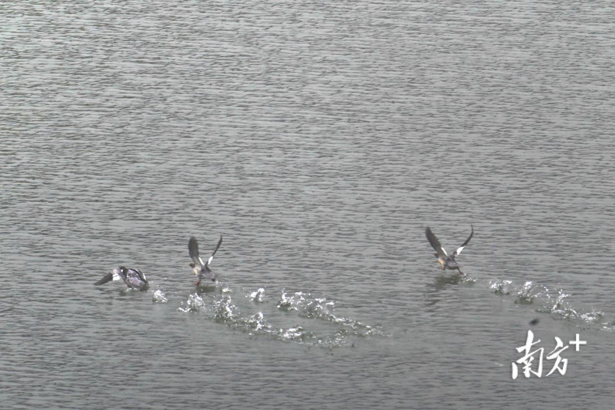 Three Chinese mergansers, or scaly-sided mergansers, were spotted joyfully frolicking in the lake in Gudoushan Provincial Nature Reserve, Jiangmen City, Guangdong Province recently.