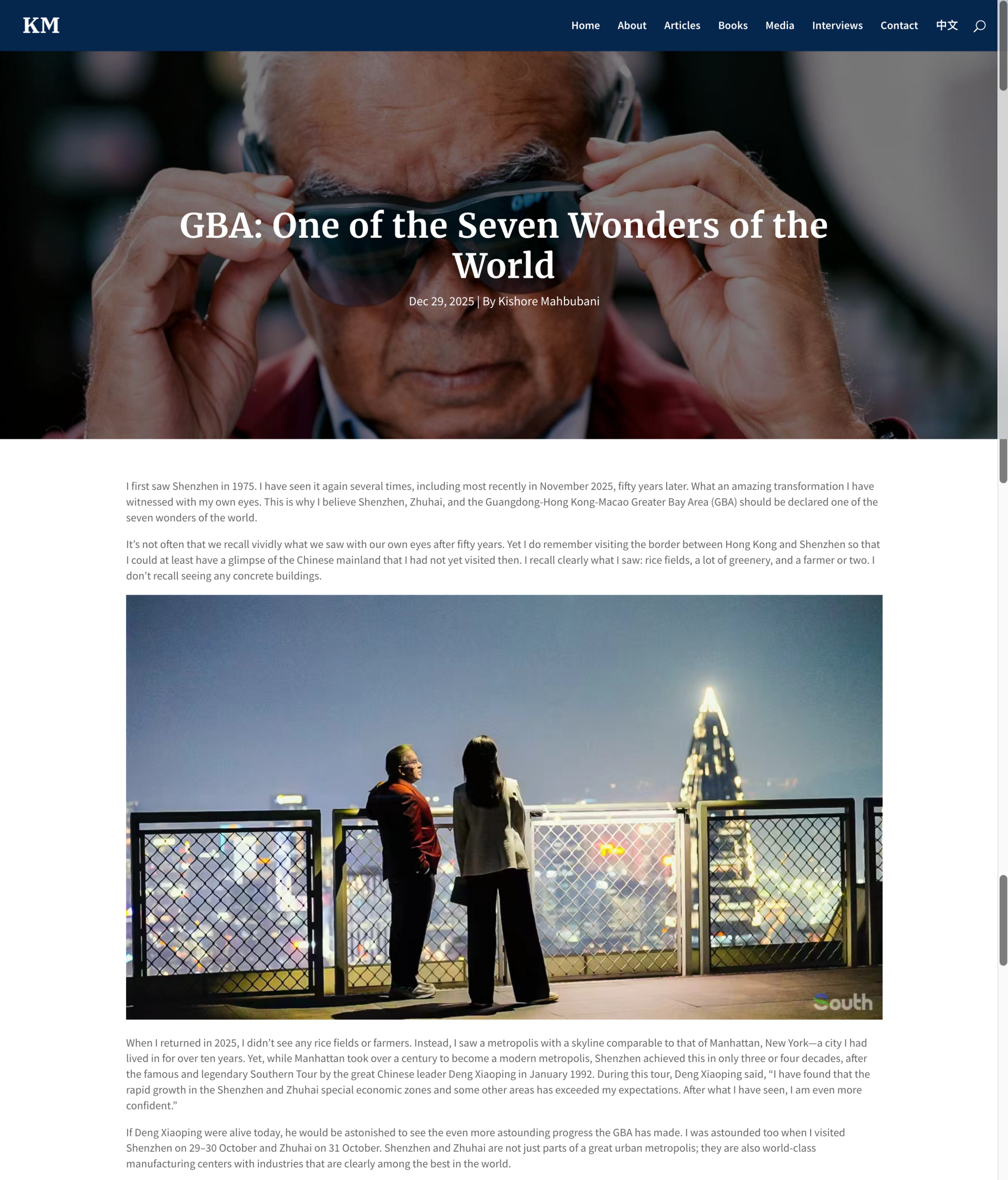 Renowned global affairs scholar and former Singaporean ambassador to the United Nations Kishore Mahbubani published an article on his personal website on December 29, reflecting upon his recent trip to China's southern province of Guangdong, dubbing the Guangdong–Hong Kong–Macao Greater Bay Area (GBA) as "one of the seven wonders of the world."