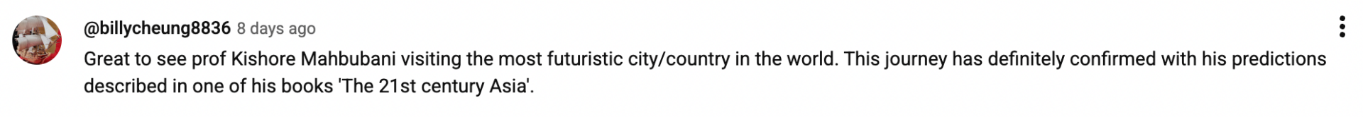 The related video reports attracted wide international attention. Some viewers wrote that Mahbubani's visit to what they described as one of the world's most futuristic cities confirmed ideas he had outlined in his book The Asian 21st Century.