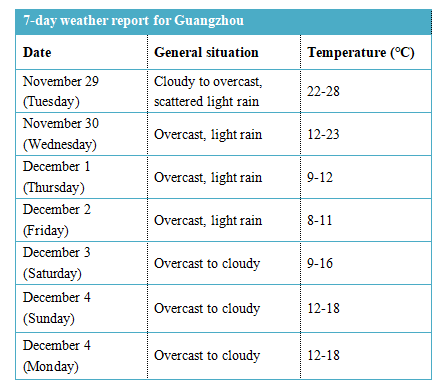 The cold wave is expected enter the northern Guangdong during the daytime of November 29 and arrive in Guangzhou in the early hours of November 30. There will be an average temperature drop of 12℃-15℃ in the central-northern areas of the province, 8℃-12℃ in the south.