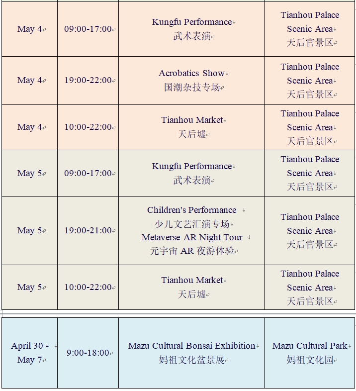 During the event, activities such as Mazu maritime patrol, Mazu cultural seminar, Mazu bless peace banquet, Mazu kinship cultural exchange, and Tianhou market will be held. Tourists can also enjoy the Mazu Light Show and watch the AR Night Tour Contest.
