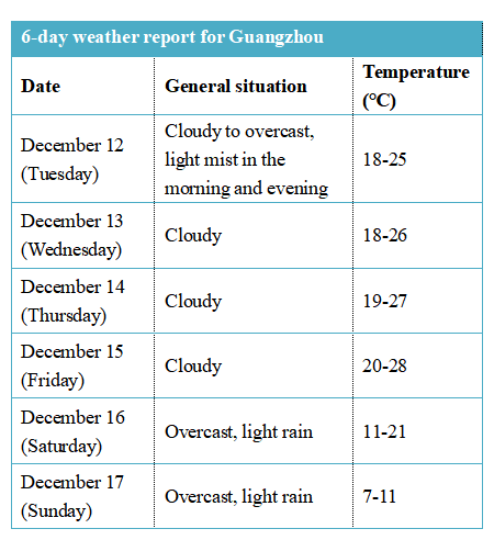 The temperatures will warm up from Wednesday. On December 13 and 14, lows in north Guangdong are expected to range from 12-16℃, 19-23℃ in west Guangdong and Pearl River Delta, and 16-19℃ in the remaining areas. West Guangdong is likely to experience cloudy skies with overcast periods and localized light rain, while other regions will be cloudy with sunny spells.
