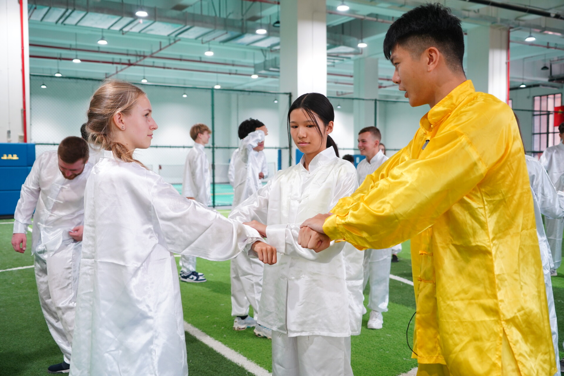 The lesson included horse stance and stake training, the fist salute, the first three forms of the Twelve-Form Tai Chi, and basic qinna (grappling) techniques—guiding students to experience the deeper philosophy behind martial arts through practice.