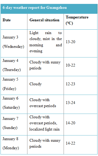 On January 4, most parts of the province will be sunny to cloudy. The lowest temperatures will stay around 6 to 9 degrees Celsius in north Guangdong, 13 to 17 degrees Celsius in west Guangdong, and 10 to 13 degrees Celsius in the remaining areas.