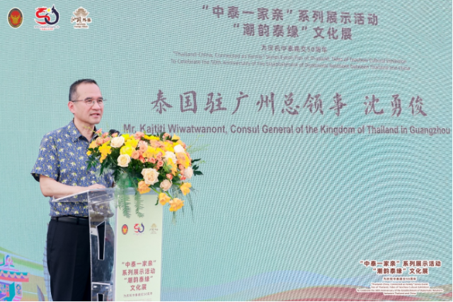 Mr. Kajtiti Wiwatwanont, Consul-General of the Kingdom of Thailand in Guangzhou, spoke highly of the profound Thailand-China friendship embodied by the concept of "Connected as Family" in his speech. He reiterated that Southern Chinese cultures, such as those of Chaoshan region (Guangdong cities of Chaozhou, Shantou and Jieyang) and Hainan, have taken root in Thailand through overseas Chinese, and the spread of beliefs and intangible cultural heritage, such as cuisine and lifestyle, in Thailand is the best testament to this. He expressed the expectation that this exhibition will serve as an opportunity to further enhance cultural connectivity and resonance between the peoples of the two countries.