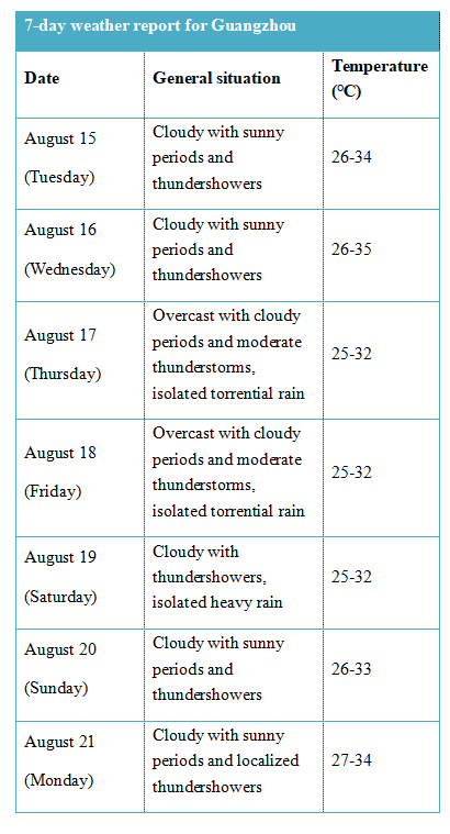 On August 15, Shaoguan, Qingyuan and Zhaoqing will be cloudy with overcast periods and localized heavy rain. The remaining areas will be sunny to cloudy with thundershowers. The maximum temperatures in some cities and counties will hit 36℃.