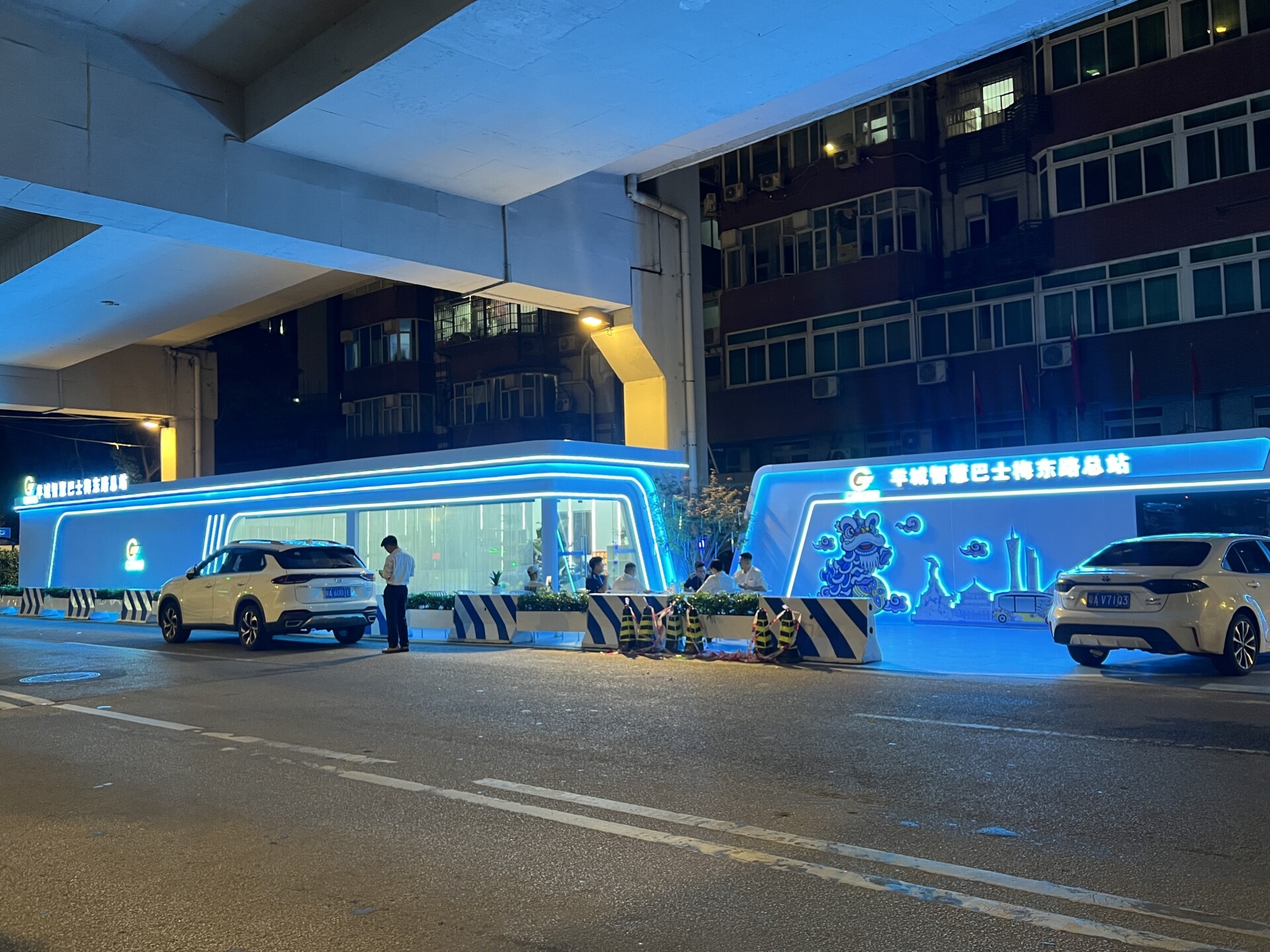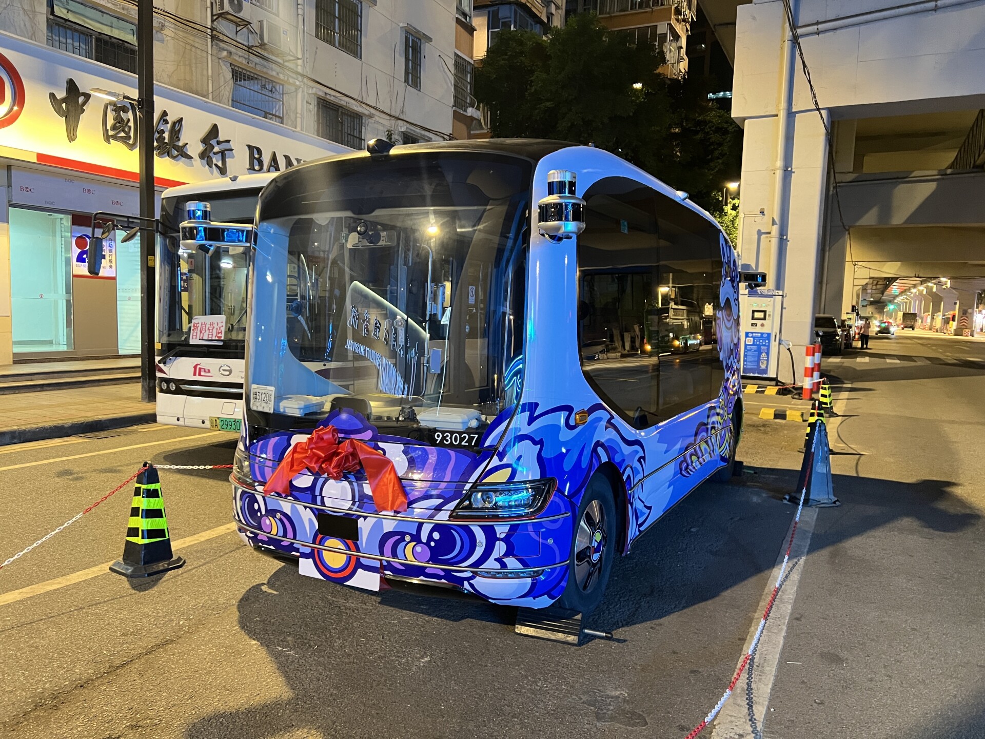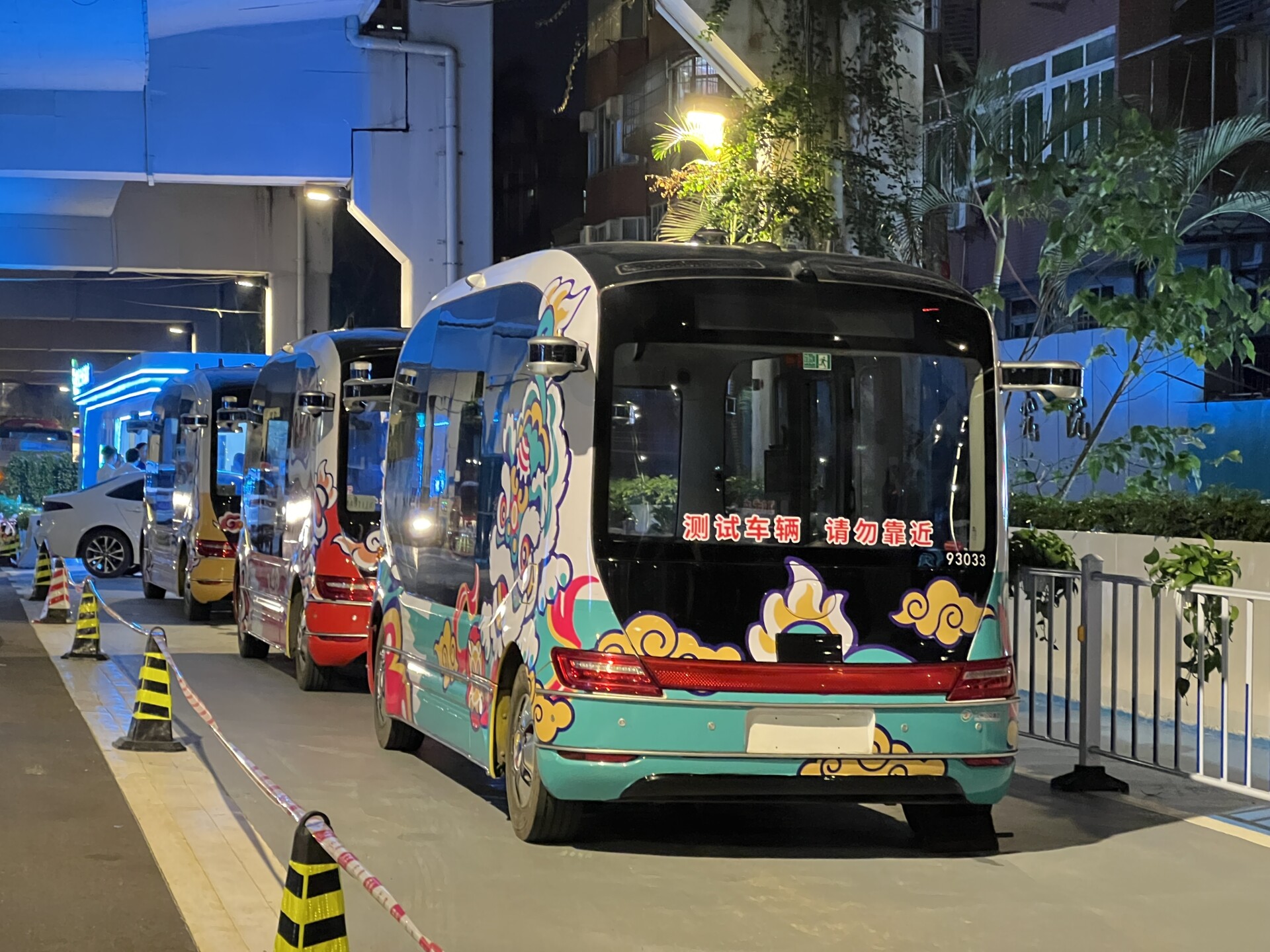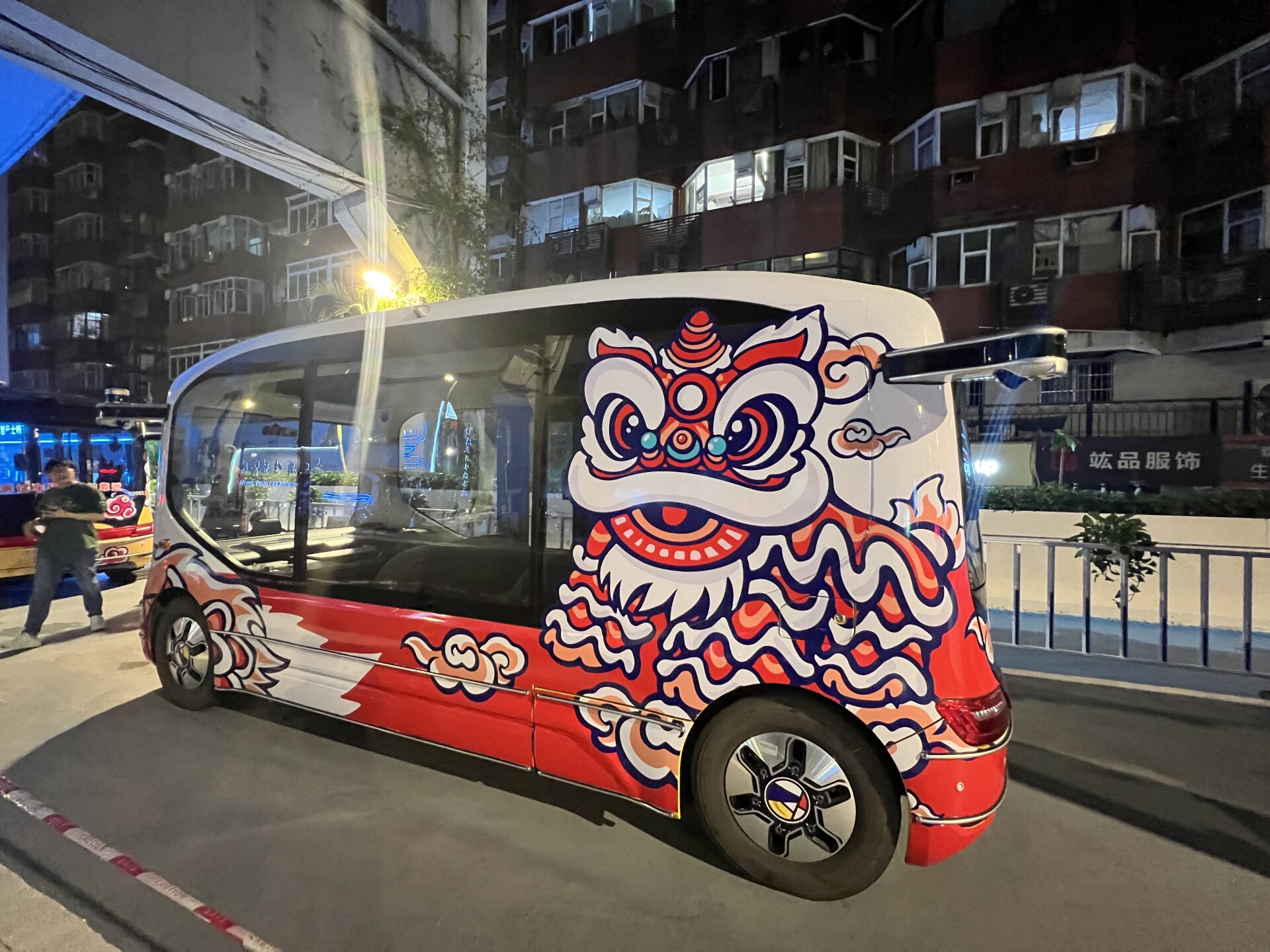 Around 10 PM on April 28, the bus route sign was illuminated at the intersection of Zhongshan 1st Road and Meidong Road, near Exit D of Yangji Metro Station. The buses, which can accommodate six passengers each, feature vibrant lion designs and are themed in red, green, yellow, and purple.