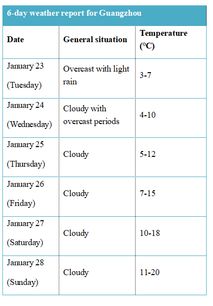 A new cold front bringing light rain is forecast to impact Guangdong from Monday (January 22) to Wednesday (January 24), with temperatures of about 5 degrees Celsius and below expected in most parts of the province, according to the Guangdong Meteorological Observatory.