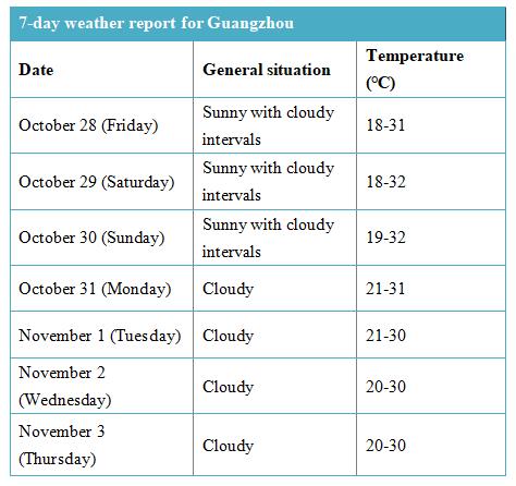 On October 30, Guangdong is likely to see clear skies with cloudy intervals. The lows will be 21℃ to 24℃ in the costal areas near the Pearl River Estuary and west Guangdong, 16℃ to 19℃ in north Guangdong, and 18℃ to 22℃ in other areas.