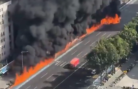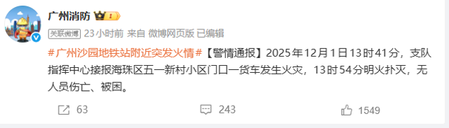 According to the Guangzhou fire department, the incident occurred at 13:41 near the entrance of Wuyi Xincun residential community, where a truck burst into flames. Firefighters extinguished the blaze by 13:54. No injuries or trapped individuals were reported.