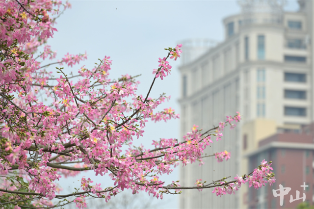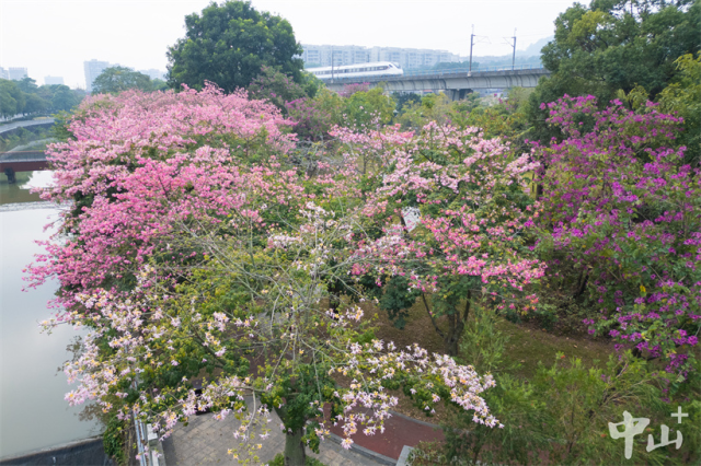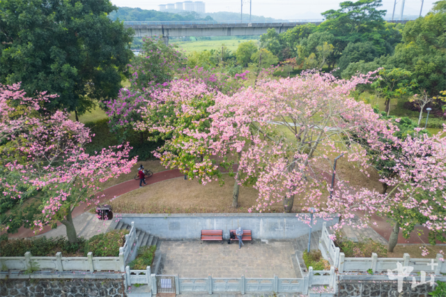 A stretch of riverside in Zhongshan's Nanlang subdistrict has drawn visitors this week, as the silk floss trees have entered full bloom along the Daxi River. The pink flowers create a striking contrast with the waterway and greenways, offering a remarkable sight during the mild winter.