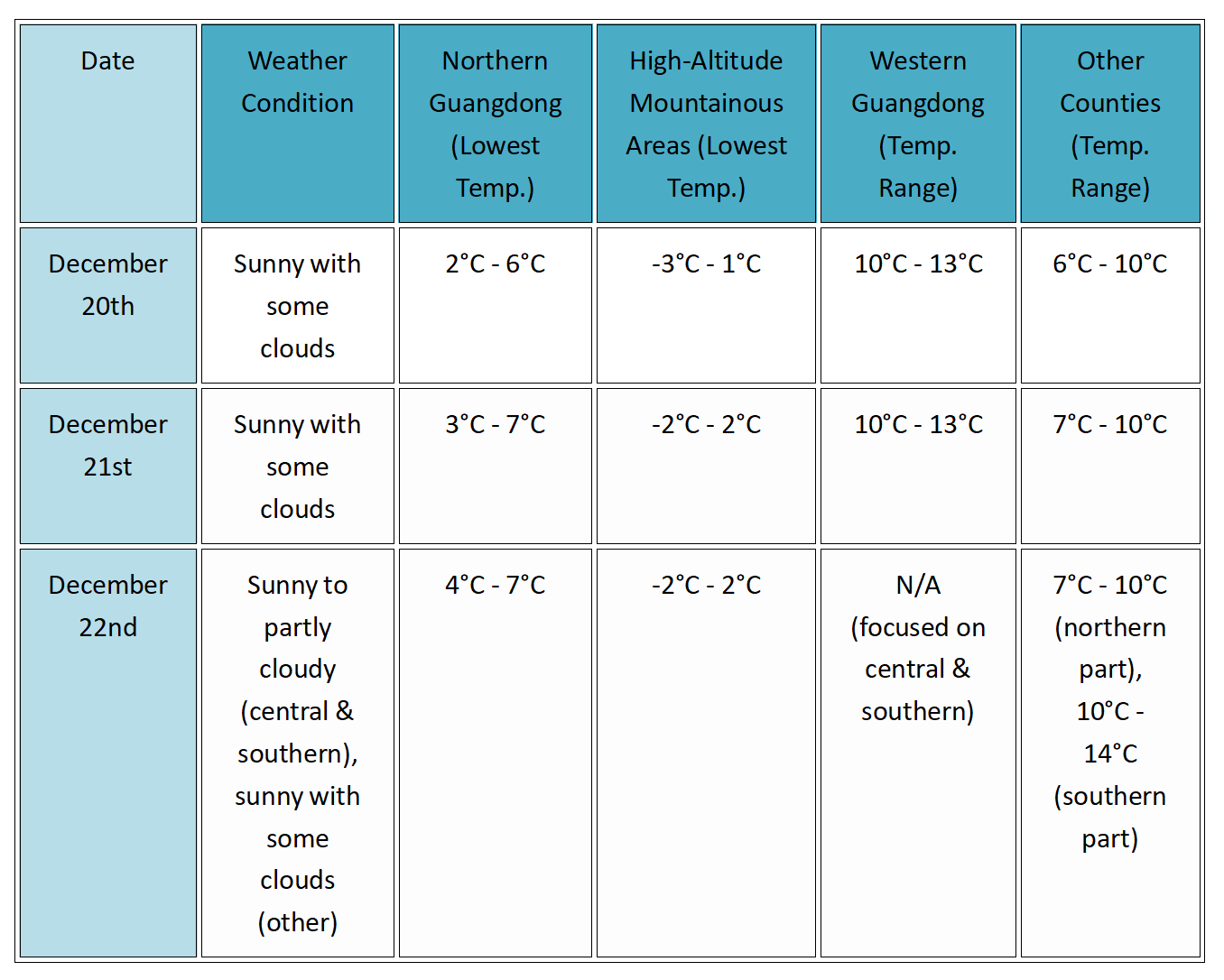Guangdong will continue to experience sunny and dry weather from December 20th to 22nd, with morning and evening temperatures remaining cold and requiring proper warmth, according to the Guangdong Provincial Meteorological Bureau.