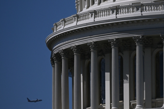 An airplane flies near the U.S. Capitol on the first day of the U.S. government shutdown in Washington, DC, on October 1, 2025.