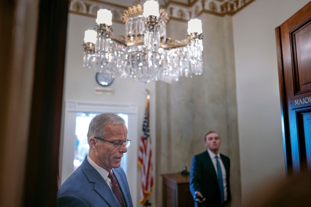 Senate Majority Leader John Thune speaks to reporters as he returns to his office in the Capitol after a vote to end the government shutdown failed.