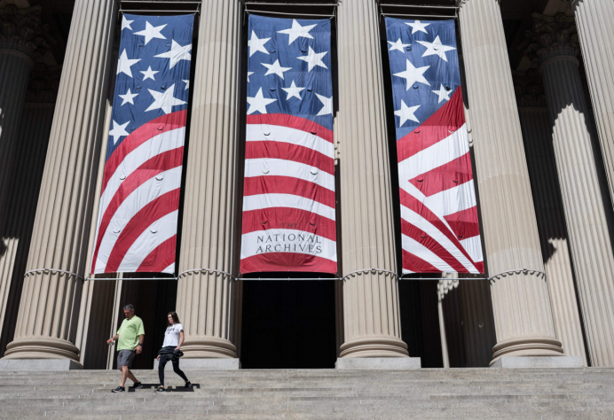 People walk down the steps of the National Archives, closed due to the U.S. government shutdown, in Washington, DC on October 1, 2025.