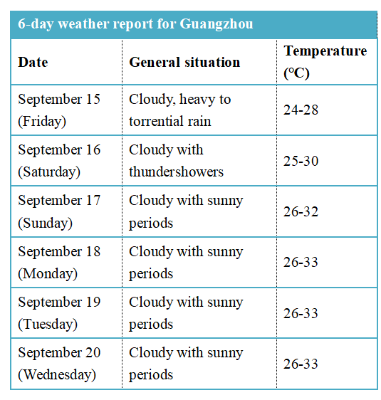 On September 15, heavy rain will fall on Qingyuan, Shaoguan, Heyuan and the Pearl River Delta. The highs will stay around 27℃ to 29℃ in east Guangdong, 24℃ to 26℃ in the remaining areas.