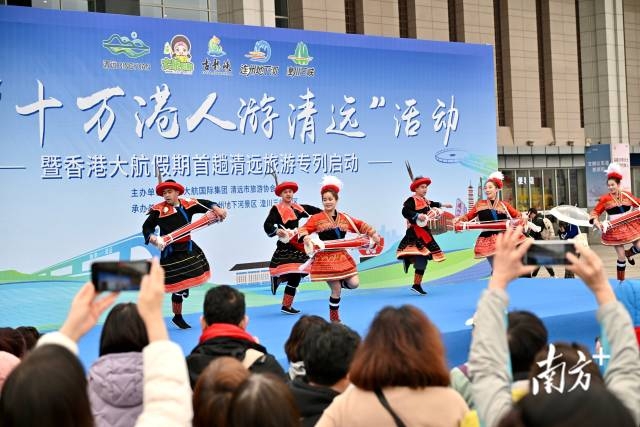 A vibrant Yao ethnic long drum dance performance captivates audiences at the "100,000 Hong Kong Residents Visit Qingyuan" launch event.