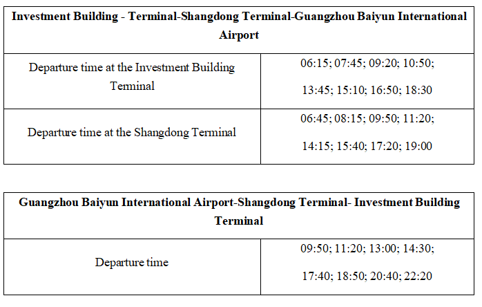 The airport express starts from the Investment Building Terminal and passes through the Shangdong Terminal, also in the Torch Development Zone, before arriving at the Baiyun Airport. The 140-kilometer trip takes about 150 minutes.