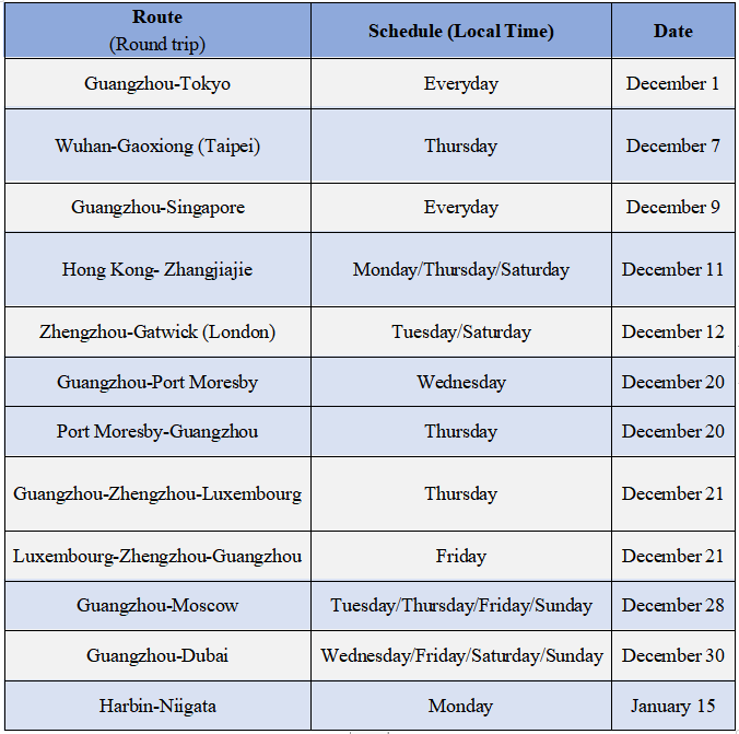 Among them, the Guangzhou-Tokyo route will have two daily round trips, the Guangzhou-Singapore route four daily round trips and the Guangzhou-Dubai route 11 weekly round trips.