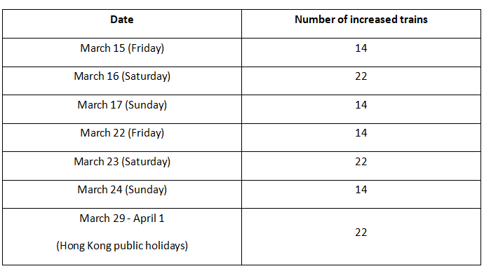 To meet the increasing travel demand, about 200 additional trains will be operated from Futian Station in Shenzhen to West Kowloon Station in Hong Kong starting from March 15. The number of trains to be increased on the following dates is as follows.