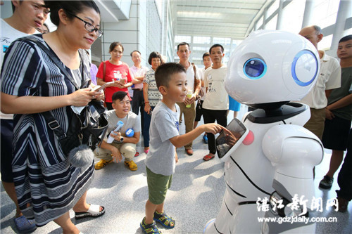 A boy is fascinated by the robot guide at the Central People's Hospital of Zhanjiang. [Photo/gdzjdaily.com.cn]