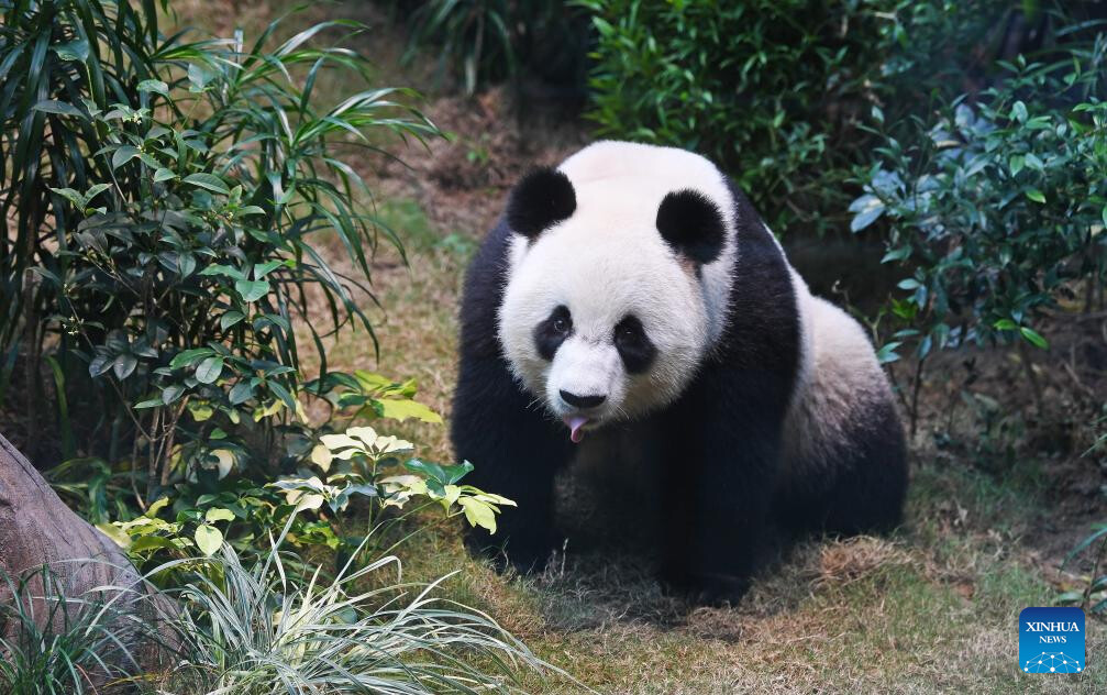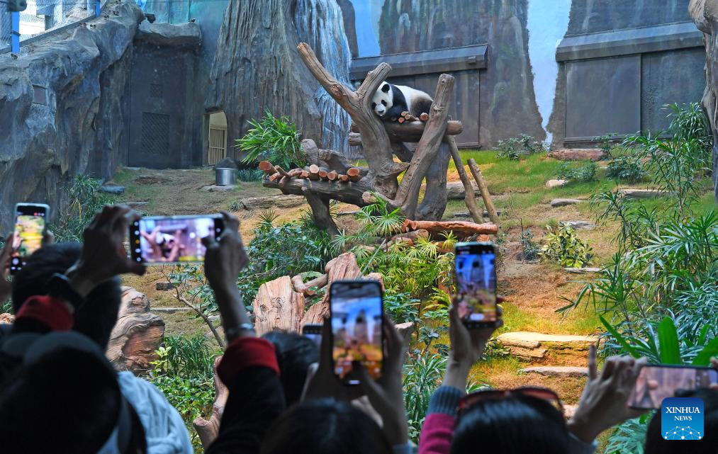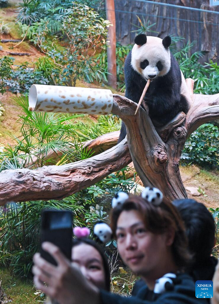A giant panda is pictured at Ocean Park Hong Kong in Hong Kong, south China, Dec. 8, 2024. Giant pandas "An An" and "Ke Ke" gifted by the central government to the Hong Kong Special Administrative Region (HKSAR) made their public debut at Ocean Park Hong Kong on Sunday. (Xinhua/Chen Duo)