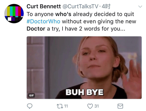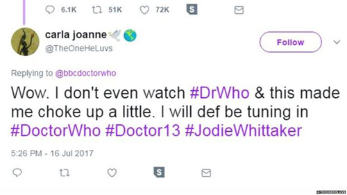 卡拉•乔安娜在推特上说,她会收看节目,而预告片让她“有点哽咽”。另一位推特用户阿亚德称:“我根本不看《神秘博士》,但是一位女博士太酷了。”