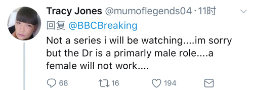 另一位网友称:“我是不会看剧了,很抱歉,但是博士本来就是男性角色……找个女性是行不通的……”